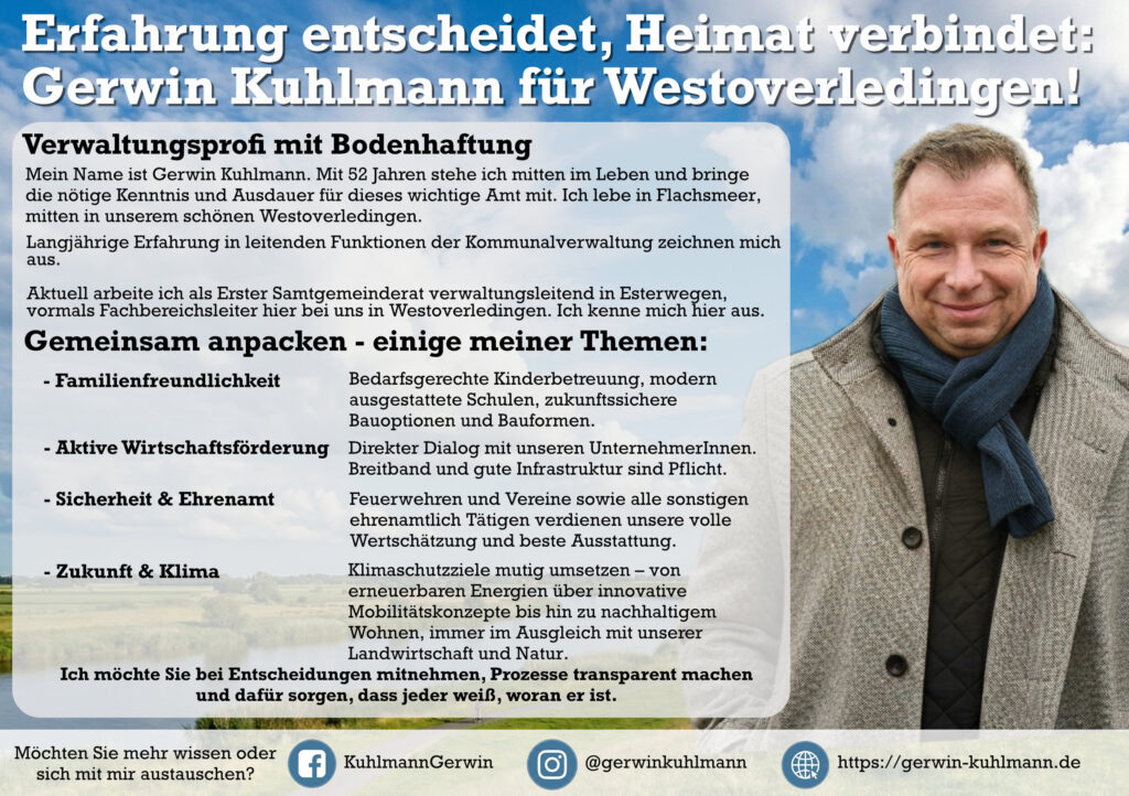 - Infrastruktur der kurzen Wege: Ob Spielplatz, Hausarzt oder Nahversorgung – Lebensqualität entscheidet sich vor der Haustür. Ich werde mich für den Erhalt und Ausbau der dörflichen Infrastruktur einsetzen, damit Westoverledingen für alle Generationen attraktiv bleibt.